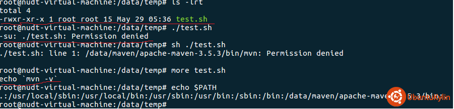 我在vmware上安装了银河麒麟社区服务版(Kylin-4.0.2-server-sp1-Community-20170412-x86_64.iso),发现执行shell脚本时,都会报权限不足的错误,必须在可执行文件前添加sh 才行。 例如我写了个test.sh用于查看maven的版本号,test.sh的内容为 echo mvn -v,用root用户编写后执行chmod a+x test.sh赋权,在PATH中添加当前路径 export PATH=.:$PATH,生效后执行./test.sh报错,执行sh ./test.sh后,test.sh可执行,但里面的mvn -v命令报错,报错皆为:permission denied。见图: