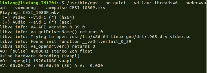 $ /usr/bin/mpv --no-quiet --vd-lavc-threads=6 --hwdec=vaapi --vo=opengl --ao=pulse CESI_1080P.mkv