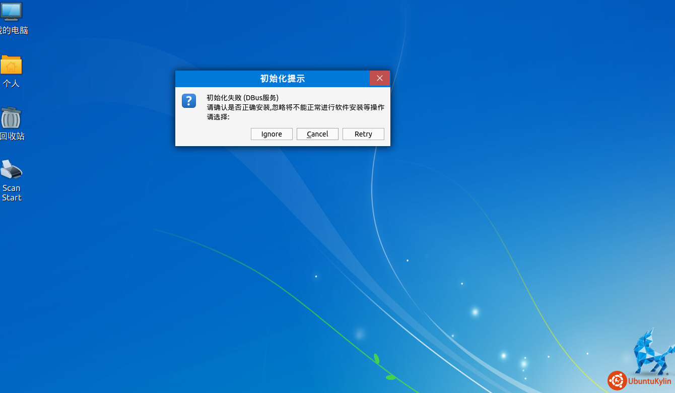 今天新装了银河麒麟飞腾版系统,更新了一下麒麟软件中心程序,结果出现软件中心崩了出现这种提示初始化失败(DBus服务),求解要怎么才能解决?