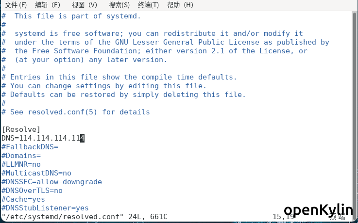 因为openkylin没有配置默认的dns,使用管理员身份编辑/etc/systemd/resolved.conf文件