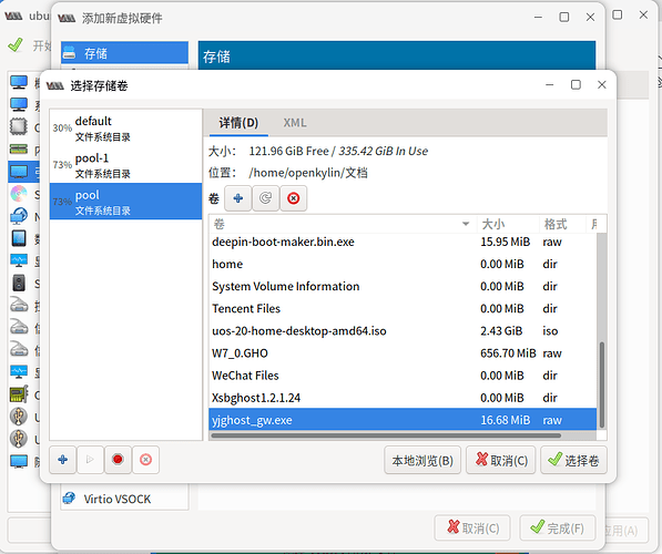 在弹出的对话框里点击“浏览”。在弹出的对话框里选择你存放VHD文件的文件夹,点击完成。在“选择存储卷”的页面右侧点中你创建的VHD文件,点击“选择卷”然后启动虚拟机,安装系统。