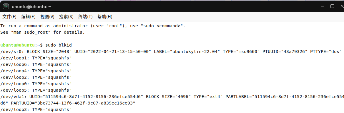 使用sudo blkid 命令进行查看。