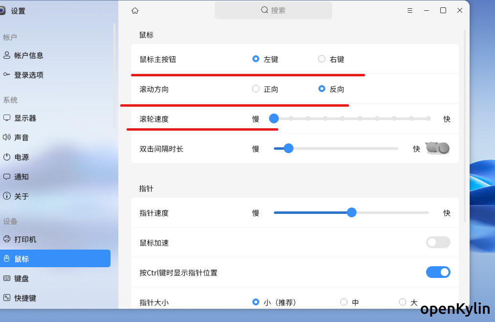 第一个“ukui”的鼠标反向,且鼠标设置界面的“正向-反向”主按钮、速度这几个选项都是失效的。