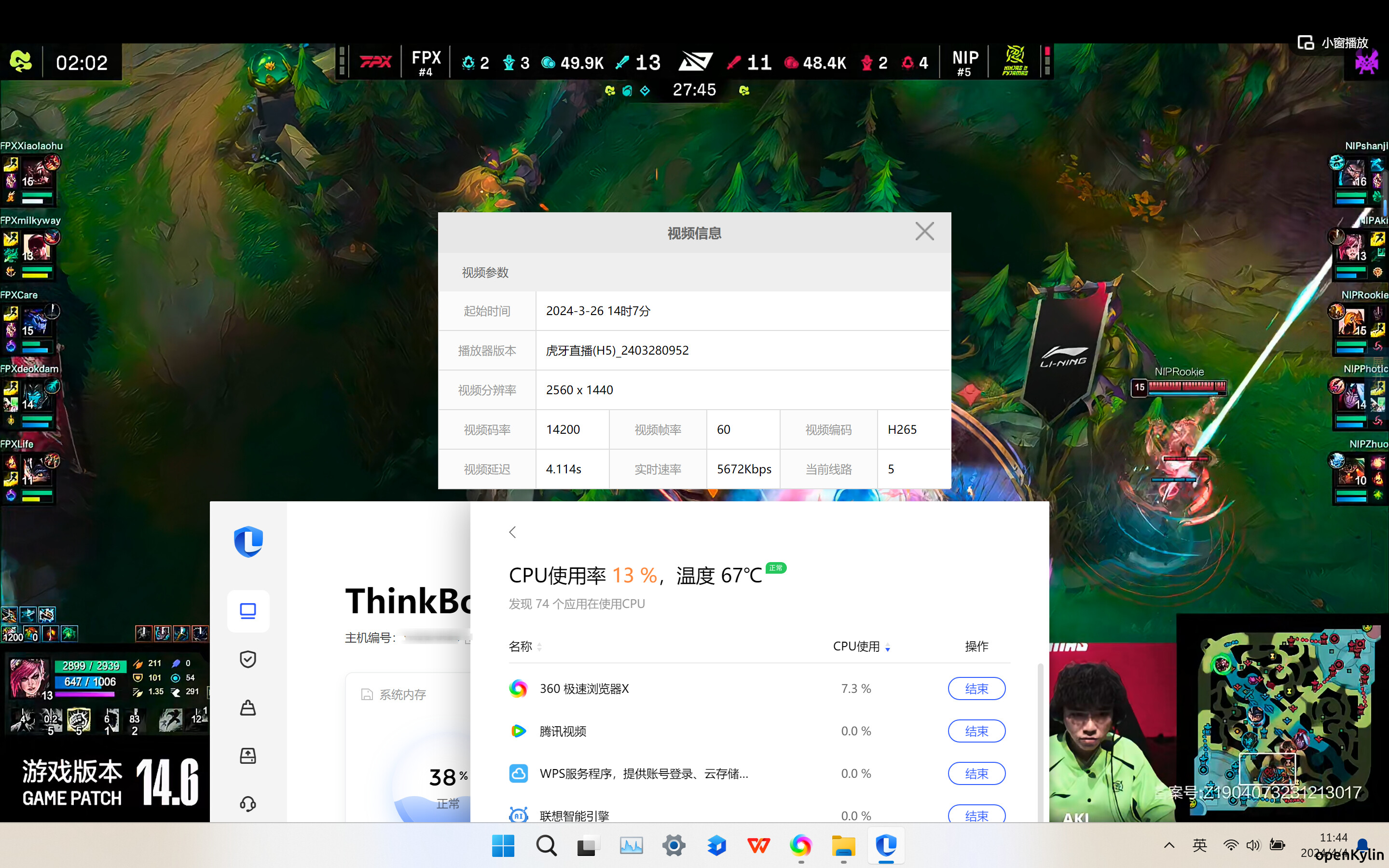 打开360浏览器,开启硬件加速,观看虎牙直播,视频信息选择2K,HDR