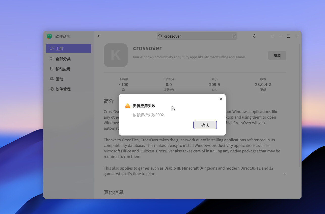 你好这里是FAQ sigcrossover依赖已经修复了,只不过现在好像不生成桌面快捷方式。可以直接执行/opt/cxoffice/bin/crossover