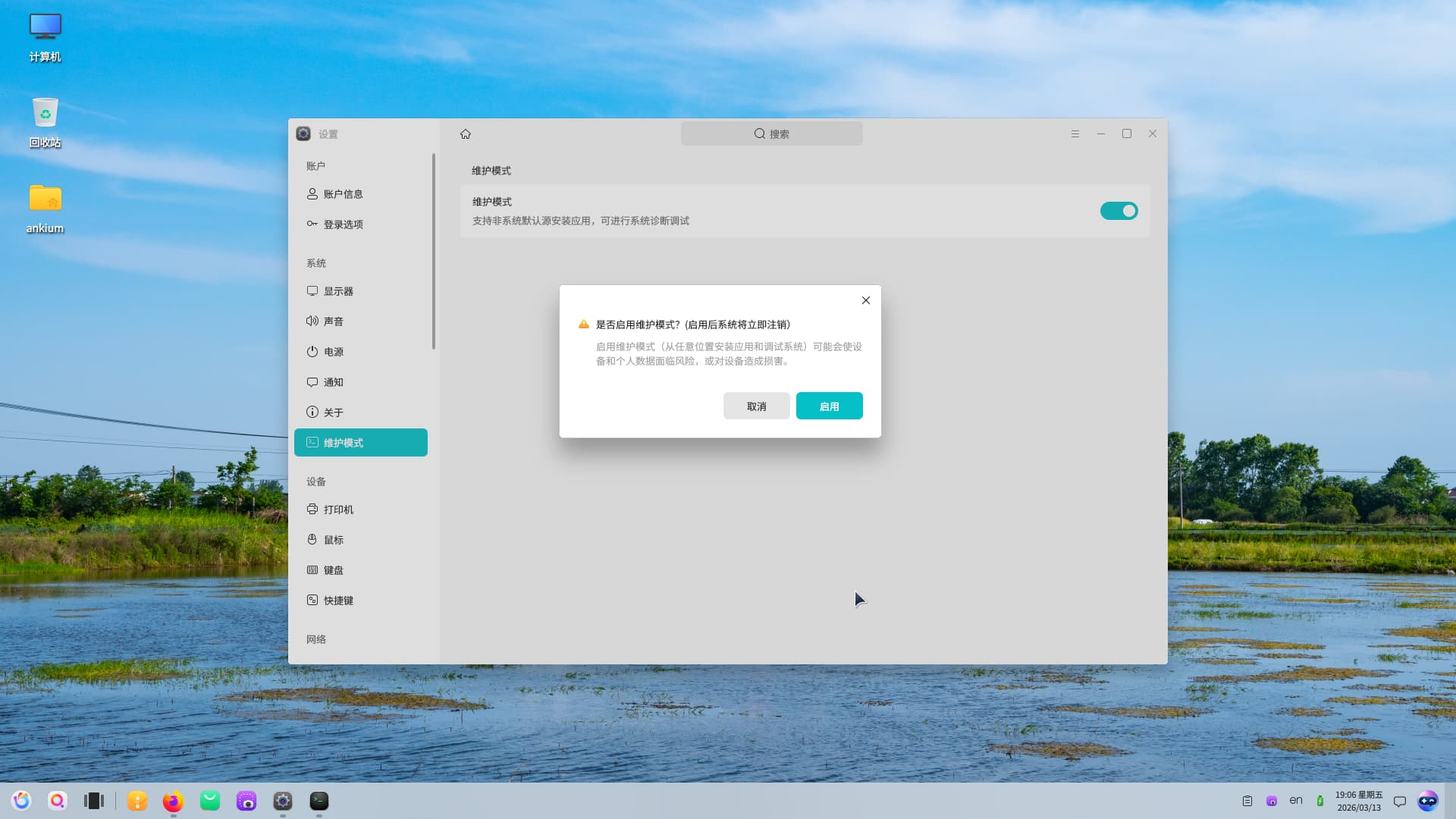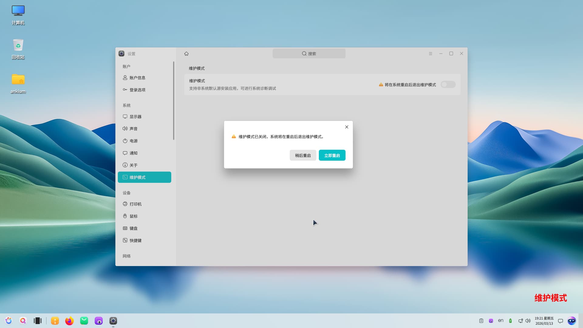 按照目前维护模式的设计理念,OK是期望以磐石架构为基础,未来主要以开明包格式的方式来分发应用,由于开明包的沙盒运行模式,如此便无需对系统关键位置的敏感数据作改动,更无需频繁重启。但现在阶段,开明包的安装方式尚未成为主流操作,所以很多软件的安装仍需通过apt或者yum以及deb包的方式来安装,这就避免不了要改动系统关键位置的数据,所以提供了维护模式这个选项。私以为,即便未来开明包在OK系统下成为主流,也仍然会有些进阶操作和改动需要读写系统关键位置(开发和运维领域的刚需),但通过频繁注销和重启系统来开启或退出维护模式严重影响系统操作效率,这直接关系到用户体验,希望能够有新的解决方案对维护模式加以改进。