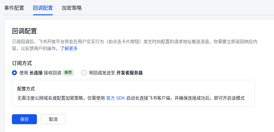 打开“事件与回调-回调配置“,订阅方式同样选择”长链接“的方式