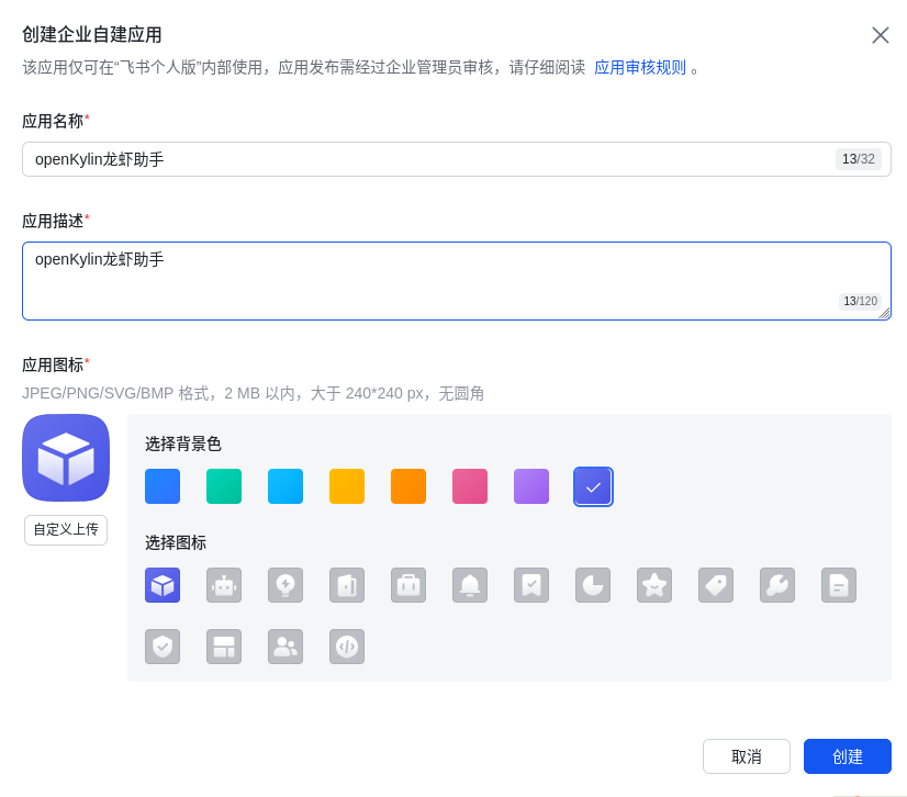 前往飞书开放平台(https://open.feishu.cn/app?lang=zh-CN),注册登录后,找到“创建企业自建应用”,按照提示完成应用创建