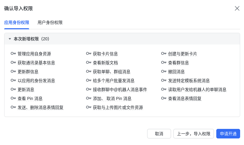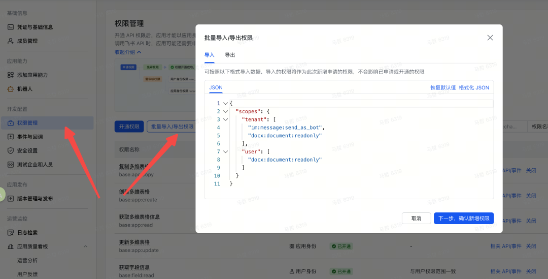 回到第一步创建的飞书应用,找到“权限管理”,点击“批量导入/导出权限”,将下方代码粘贴到代码框,并按提示完成权限开通