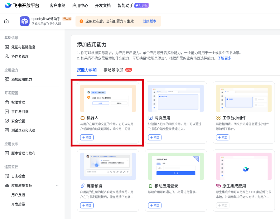 本文我们将手把手指导您,如何将部署在 openKylin 系统中的 OpenClaw 与飞书办公平台进行对接。通过本次配置,您可以在飞书中安排OpenClaw 机器人协助您处理日常工作任务,让其成为您在工作中的得力助手!接下来,我们将分步详细说明整个配置流程。