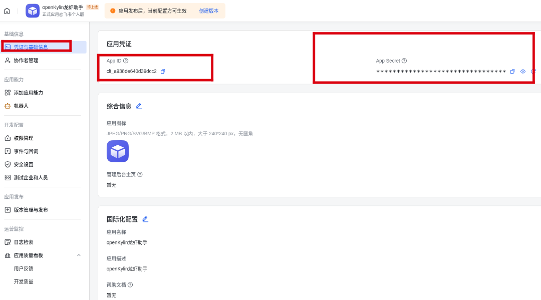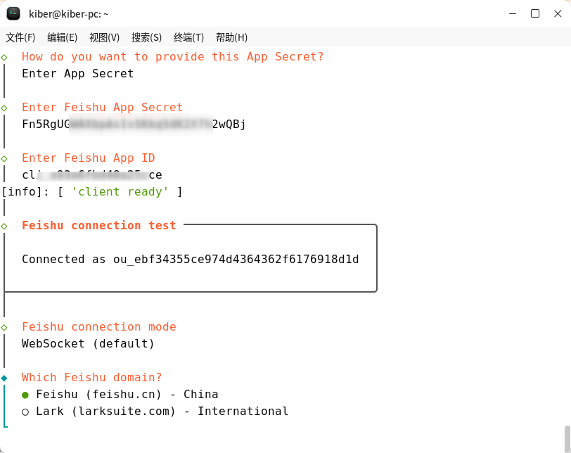 输入上一步中创建的飞书应用的App Secret和App ID,并按提示完成大模型等剩余步骤的配置(参考上一篇文章即可)