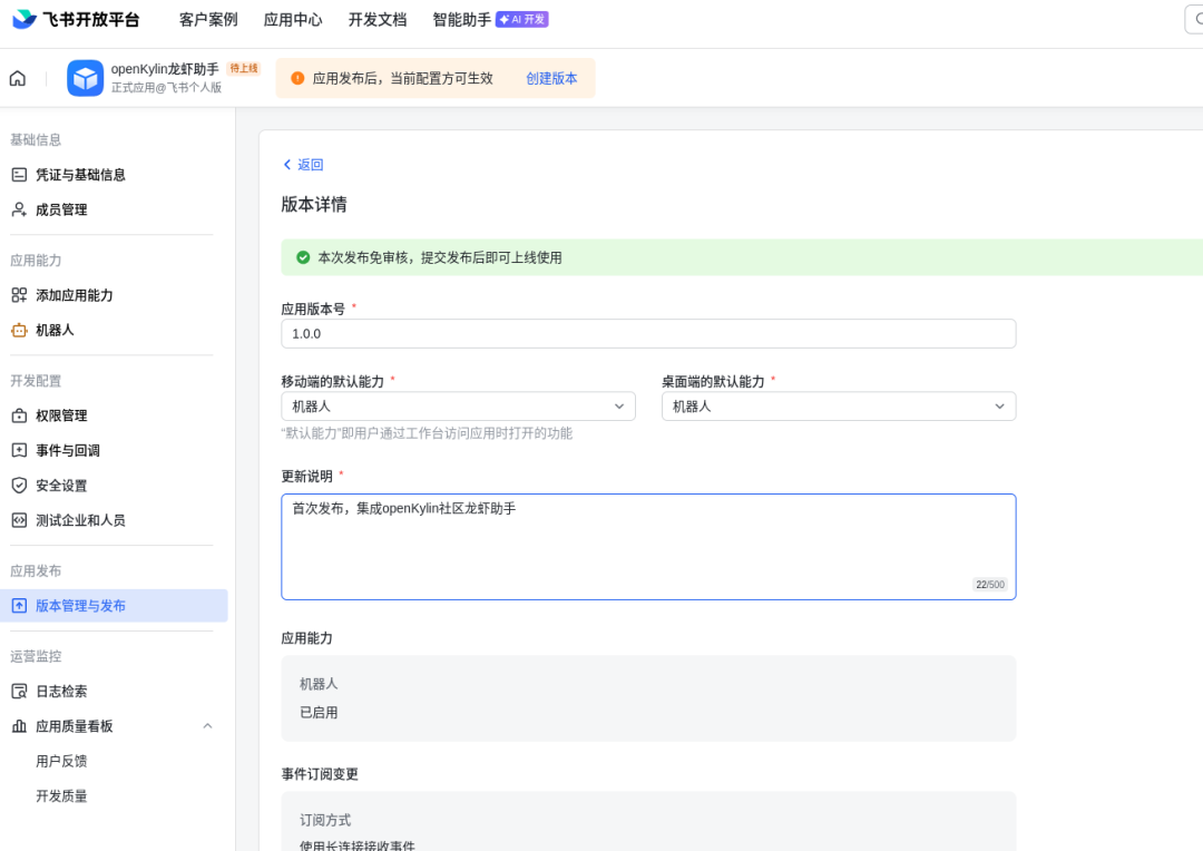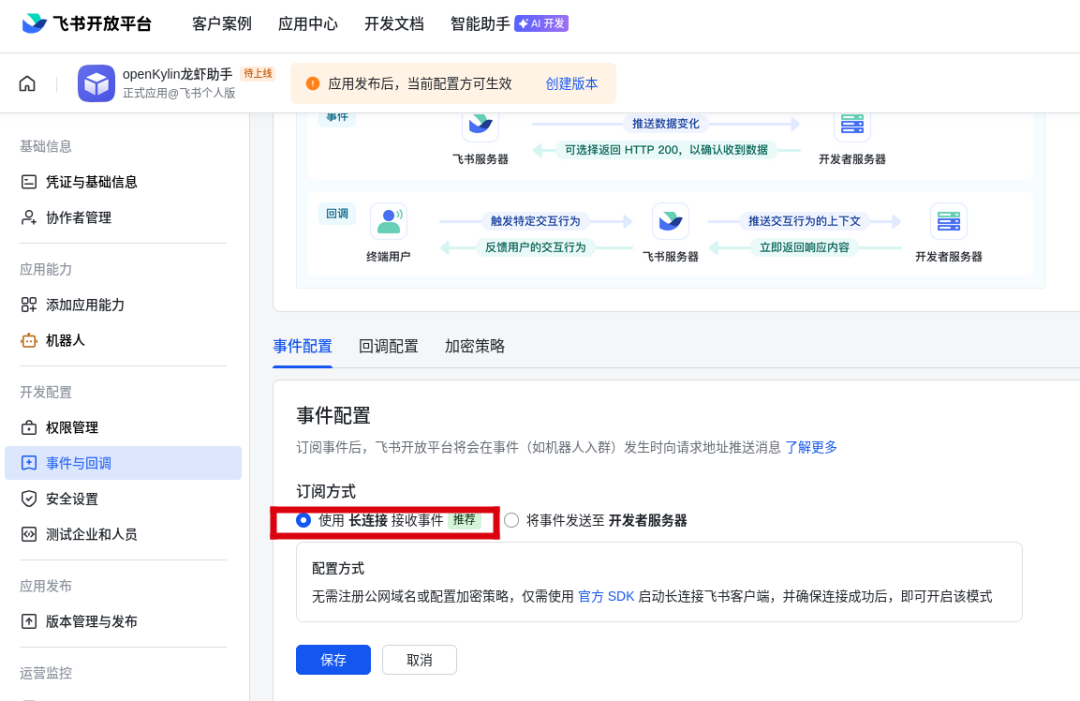 打开“事件与回调-事件配置“,订阅方式选择”长链接“的方式