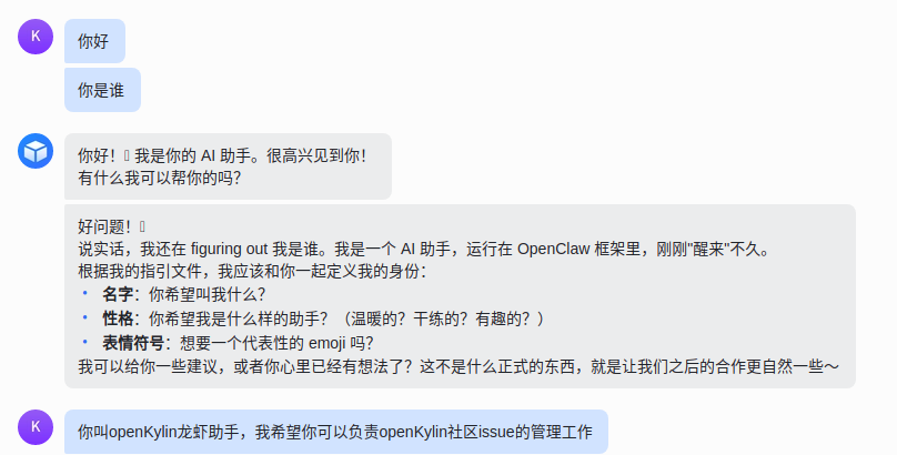 至此,您已在openKylin系统上完成OpenClaw的部署及接入飞书,可以开始你在openKylin上的“养虾”之旅了!