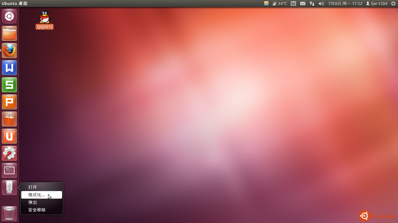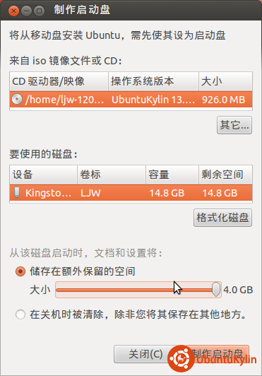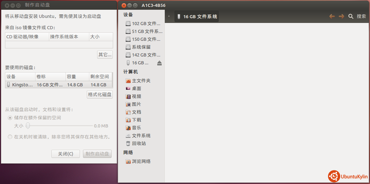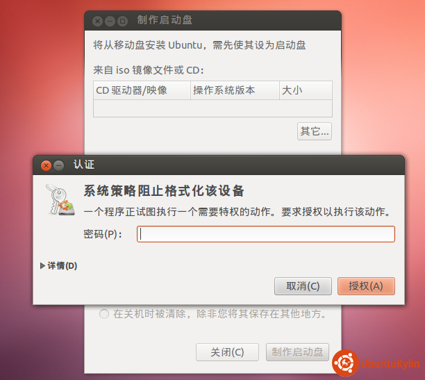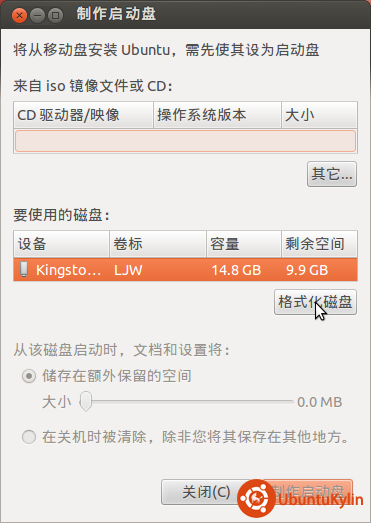 :3_52:在UbuntuKylin 13.04上,右键“格式化…”功能 - 木有;将U盘格式化完成后使用“启动盘创建器” - 十有八九会在制作过程中报错,然后。。然后就木有然后了。。又得找其他方法重新格式化U盘,然后无限死循环。。。(能成功制作,那绝对是偶然事件~)