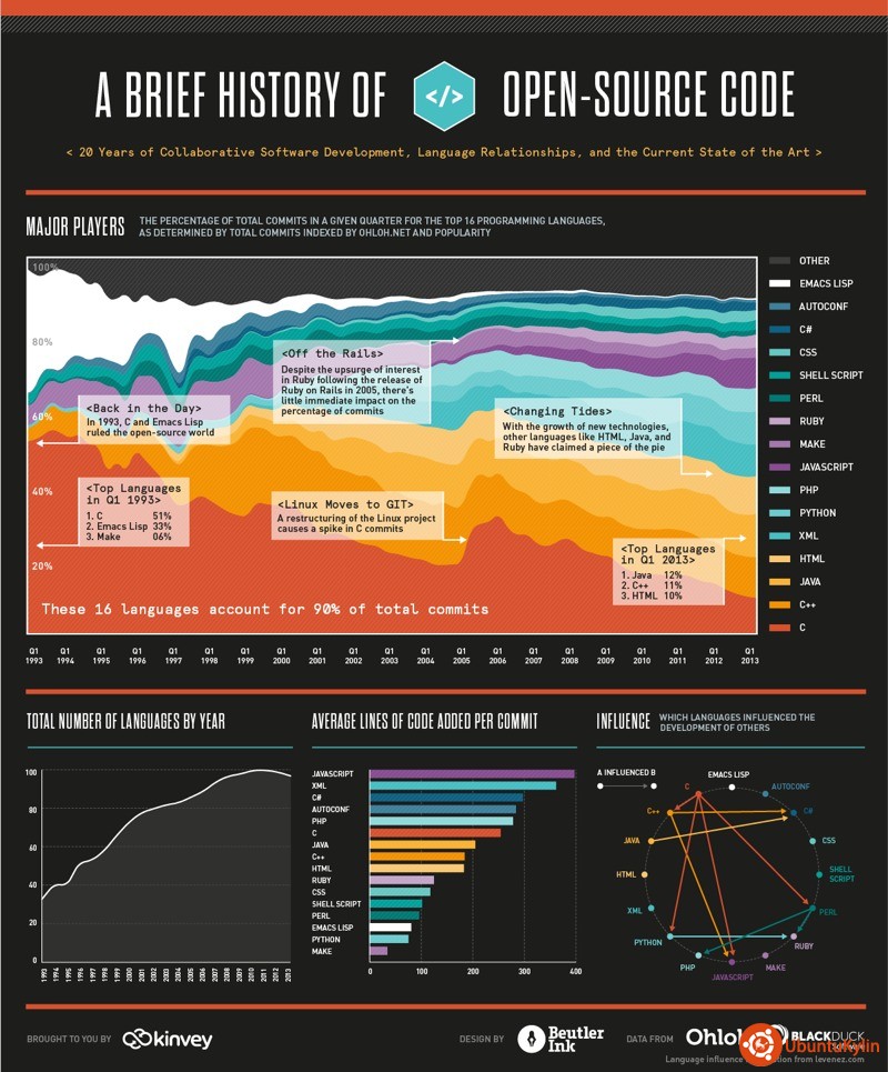 上世纪的80年代和90年代随着个人电脑和互联网的出现和普及,人类接触信息的能力有了爆炸式的增长。对于门外汉来说,这些变化可能超出了想象,但是对于计算机方面的专业人士来说,这些恰恰是他们所追求的东西。而过去20年随着计算技术的发展,编程语言也从未停止进步。大部分的编程语言都是开源,也就是所有的人都可以使用它们来实现自己的功能和想法。比如说,你是否知道1993年最流行的开源编程语言是Emacs Lisp? Emacs一款文本编辑器,由自由软件大牛Richard Stallman开发,广泛应用在Linux系统开发者圈子中。Linux系统缺少集成的开发环境,另外Emacs也确实很灵活,所以很多的程序员用它来写代码。Emacs Lisp是由更老的编程语言Lisp演变出来的。另外,C语言是1993年最流行的编程语言,当年的比例占到了51%。而Unix的Make程序则被6%的程序员使用,它可以用来从源代码自动的创建可执行程序和库文件。而到了2013年,使用最多的编程语言是Java、C++和HTML,占到的比例分别为12%,11%和10%。而且这些编程语言还会互相影响,比如C影响了C++,Python,Javasript和Perl的发展。 Java奠定了C#的基础;Python影响了Ruby等等。这种发展还会持续下去,1993年的编程语言有40种,2013则有100种左右,而且还会有新想法出现。移动云服务公司Kinvey报告了下面这个图片,显示了过去20年开源语言和代码的变化。在这个图片中,Kinvey公司用可视化的方式,展现了1993年至今排名最高前的16中编程语言的使用情况,它们呈现出不断的高低变化,这也说明这个领域的发展时多么的快。另外还展示每一年编程语言数量的变化、彼此之间相互影响等信息。Via(readwrite)