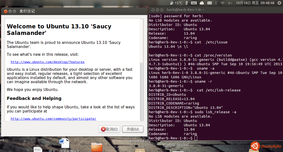 这是为何呢?怎么通过升级到ubuntukylin 13.10 呢?我查了下版本号,找不到有ubuntukylin的信息了,怪了,当初安装得肯定是-kylin啊