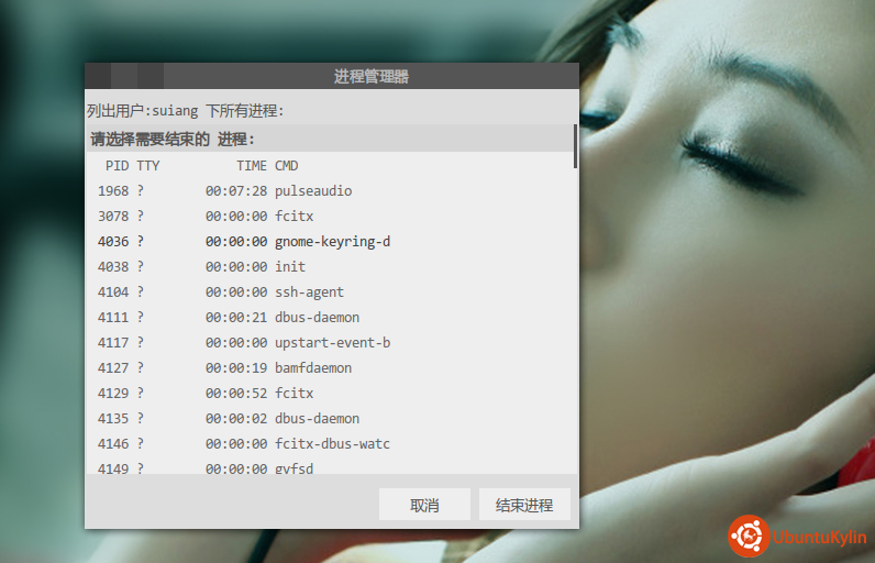 process=$(ps -u $USER | yad --title="进程管理器" --list --column="请选择需要结束的 进程:" --text="列出用户:$USER 下所有进程:" --button="取消:1" --button="结束进程:0" --width=450 --height=400)