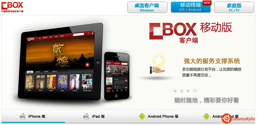作为中国人,又生长在中国,不可能不看央视节目;此时,工信部软件与集成电路促进中心(CSIP)携手国防科技大学(NUDT)与国际著名开源社区UBUNTU的支持公司CANONICAL在京宣布合作成立开源软件创新联合实验室,发起开源社区操作系统项目UbuntuKylin,这又是国人的操作系统,更要大力支持;我们的央视网上CBOX并没有Linux版可下载页面(虽说http://t.live.cntv.cn/newp2pb/ffplayer.htm可以看livecntv节目,但一太占资源,二既然是国家发起的开源项目,大家都来支持下,才能成长起来),即使尚未开发出来,能出个下载页面提示现阶段在开发中,这样可给我们这些非Win用户点希望,也能看出这系统在日趋完善、本地化,有坚强后盾。