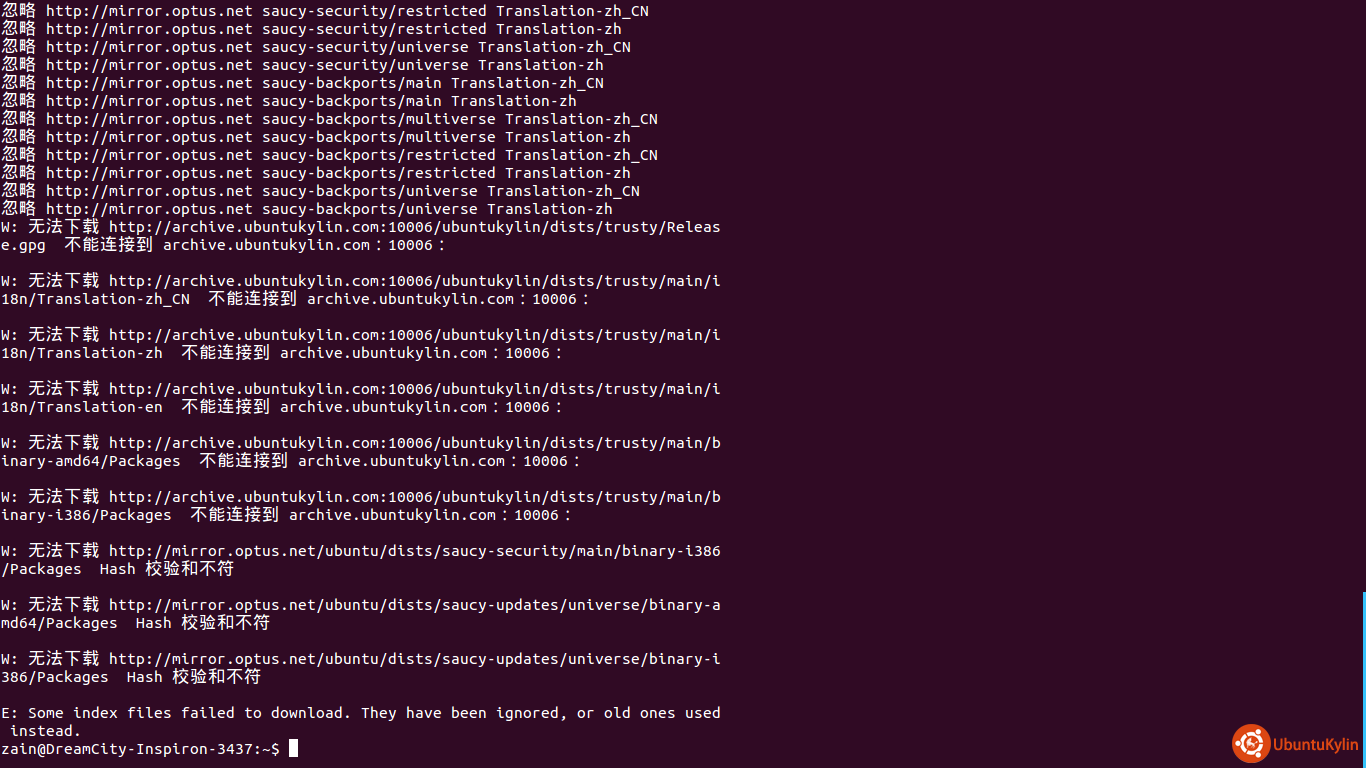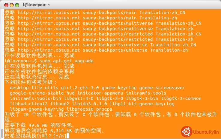 我对于启用某一个更新源的看法也许和别人背道而驰,我一出生老爸老妈给了我倔强坚持的生命,我从来不相信别人说的话,我一定要自己实践才可以相信,百度或者谷歌搜索一下对于软件源的更换和看法,也许你会看到一把一把的说法,其实他们说的是真理吗,我在心里一开始就没有相信过,,什么是较好的软件源,不能光看他下载同步数据的速度,而是分两步看待,一看速度,二:我认为看原服务器软件配套全面与否,所以在我这里中国大陆源我从不相信{并不是我崇洋媚外)而是大陆软件源太不给力了,不要光看每次你终端输入sudo apt-get update时候他是全速前进,那么我我的疑问就是来自一些朋友的求助,为什么每次我安装完成的软件朋友们终端执行命令,结果没有,这就是你所启用源服务器不给力,,也许有好多朋友会说,笨鸟弟弟真爱吹牛,好吧我来证明给你们看笨鸟是真正的男子汉流血不流泪的那种,金三角枪杀中国生命时候,我一个浪子一颗爱国心,和泰国人发生了仇视结果我也不会说,我更爱我的国家中国,我更希望他强大富有,可是从这些软件源的启用我来告诉你中国源不给力,这是事实,也许以后会好因为ubuntukylin会有自己的服务器也许会加入自己的软件更新,但现在没有,不胡说了看看下面我的操作截图就知道了,,我首先告诉大家我是一个勤快的人,习惯的sudo apt-get update,但是每会提示已经最新了也就是没有更新给我安装,更换了国外的源sudo apt-get update再一看差点气死我,更新哇来了好多,下面看看截图对比吧.