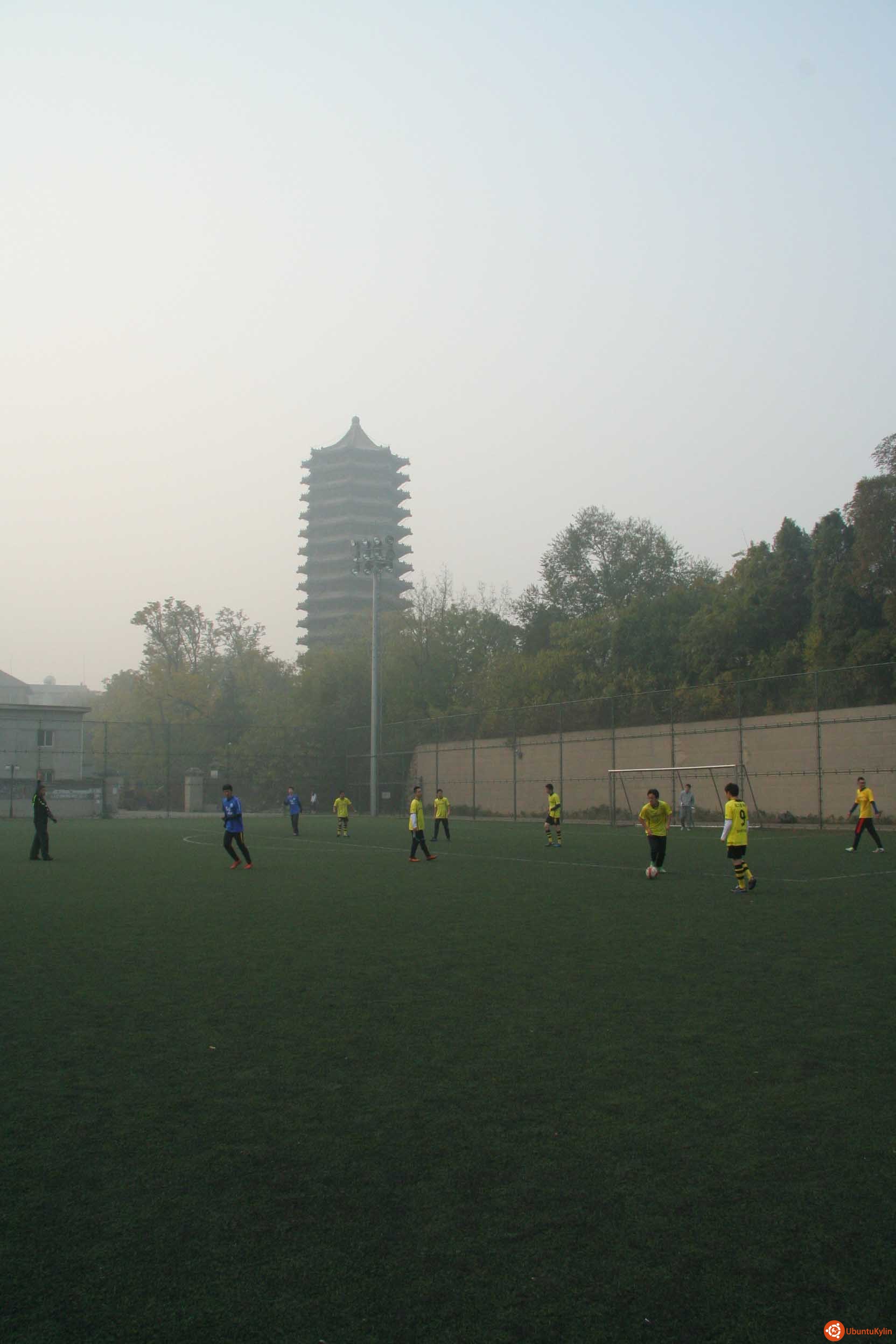 离去,走上大道,我看到一个古塔(博雅塔),我知道那个湖不远了。看到了湖,也看到了塔旁的运动场,足球场上有2场正在进行的比赛,后来打听才知道今天(11.2,周六)是北大新生杯足球赛预赛,其中一场是医学部的比赛(说明,我是学医的,酷爱足球),我进入场边观战。只看了上半场,呵~(场上局势被动,场下替补讨论着革兰阴和革兰阳的表格,还有背英语的……)医学生估计是理科生中足球很次的,全国一个样,但起码北大新生还有学校的球踢,我在锦州踢了5年的野球。再见了,北大,那种能学能动的景象我记住了。