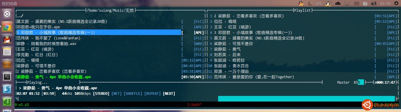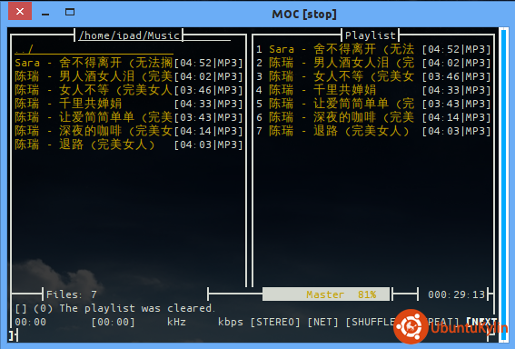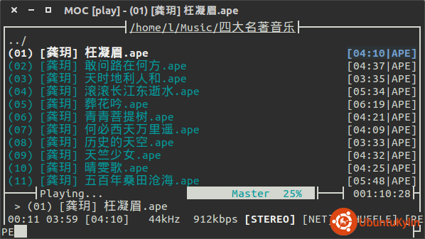 moc是一个命令行的音乐播放器,支持mp3和wma格式,播放wma要装一个ffmpeg插件,moc特别适合用在awesome上,moc安装和使用都非常的简单,重要的是有很多快捷键可以用,当你需要操作控制台的时候,按下q就可以回到shell命令行,按大q就是退出了,现在来说一下moc播放器的安装,在命令行安装或软件中心安装,安装完成了再输入mocp就可以进入moc的播放器了。