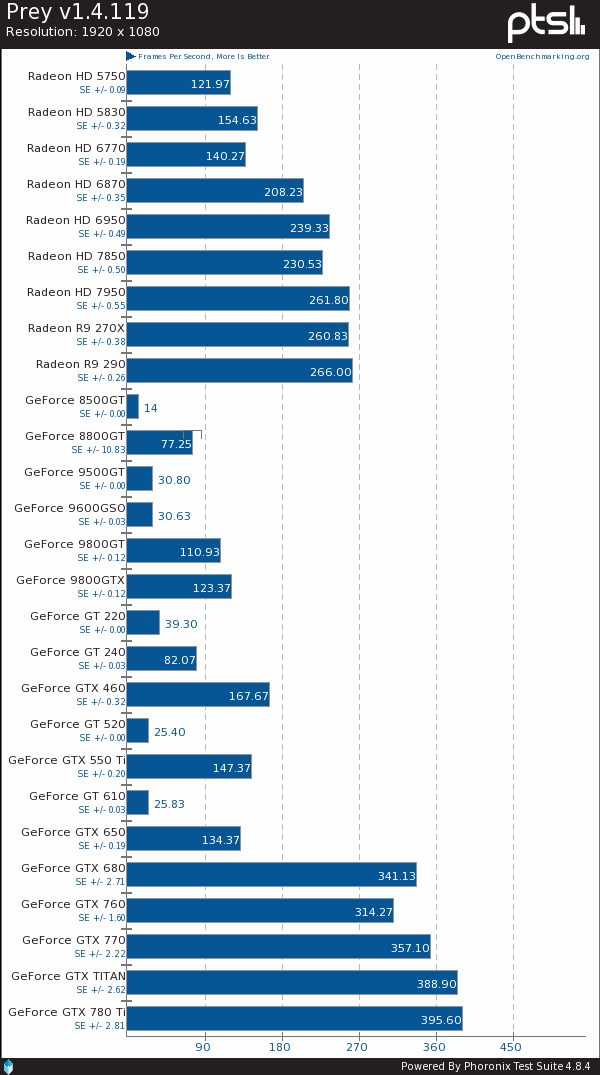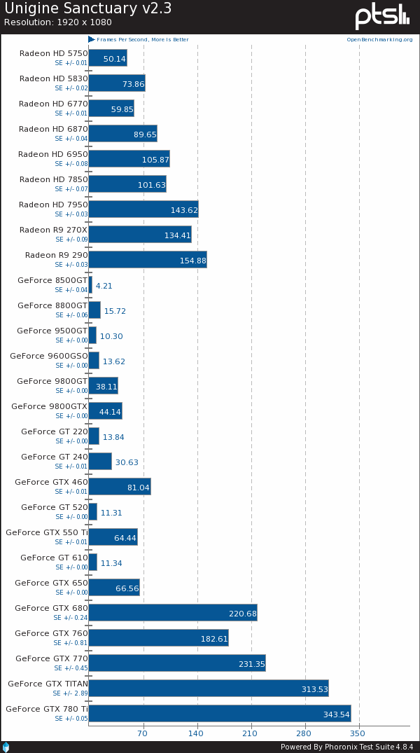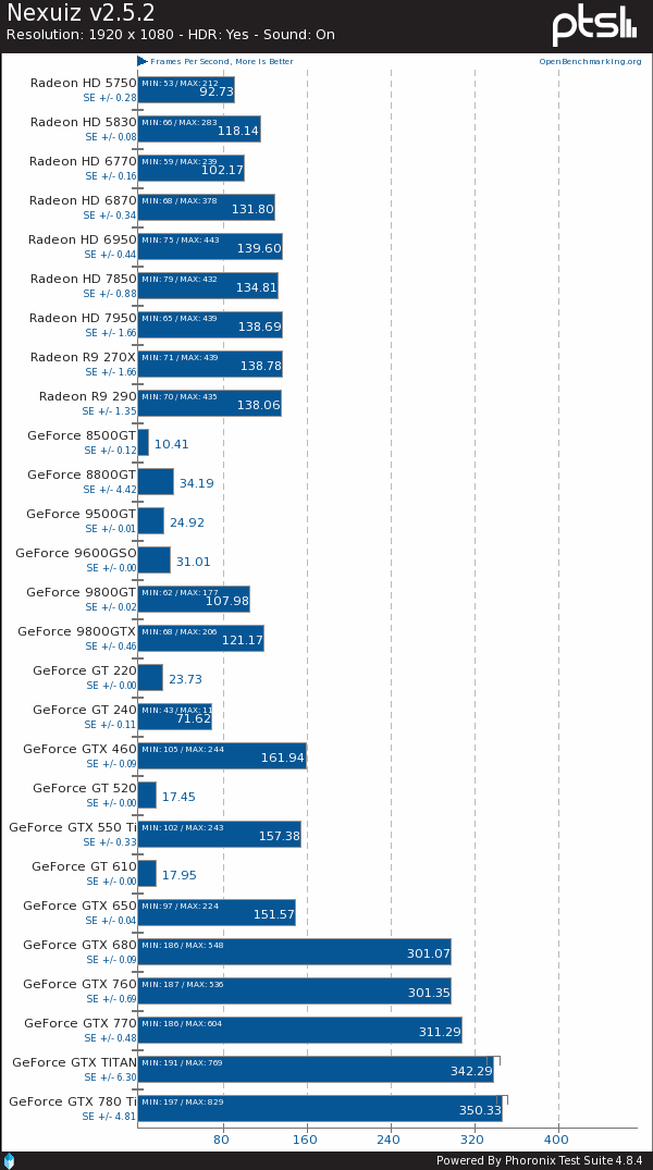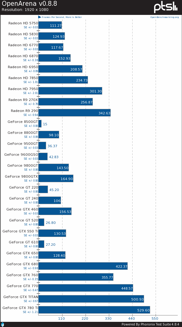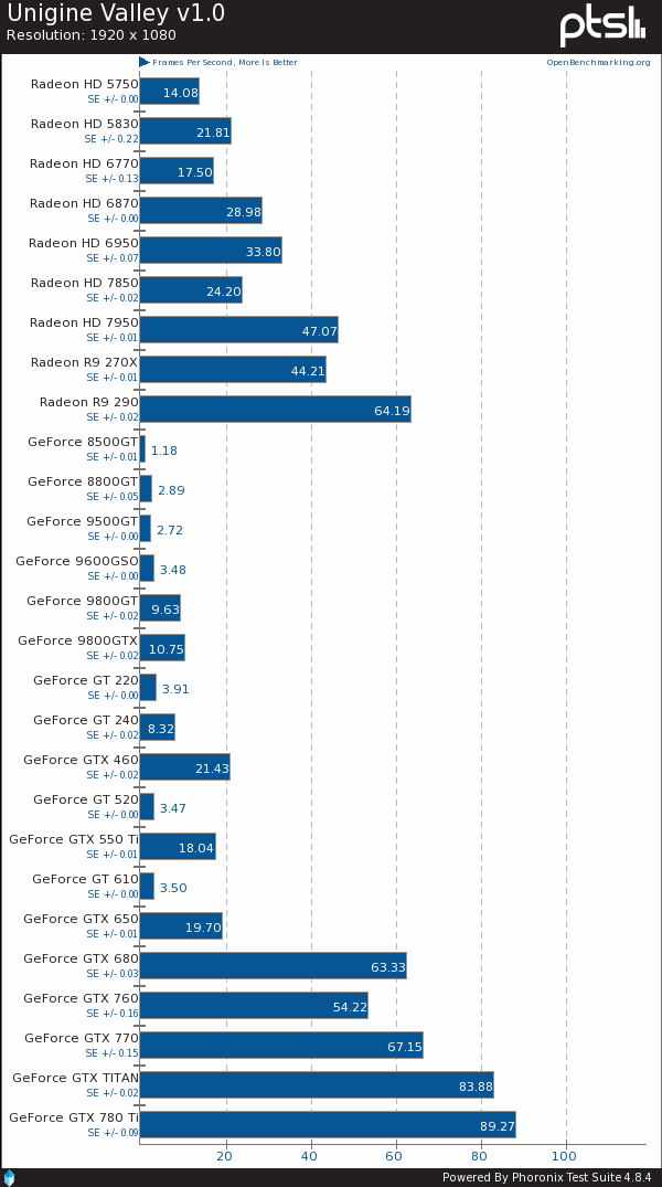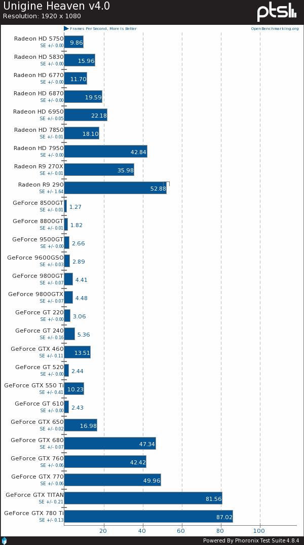 Phoronix近日组织了一次大规模显卡测试,找来总计27款的AMD、NVIDIA显卡在Linux系统下来了一场混战,且使用的是官方闭源驱动,而非开源驱动,考察的重点自然还是OpenGL性能表现。双方驱动分别为催化剂13.11 Beta 9.4、GeForce 331.20,都是最新版的。A卡只有9款,最新的是Radeon R9 290,最老的是Radeon HD 5750,再老的当前驱动就不支持了。N卡多了一倍,最新的是GeForce GTX 780 Ti,最老的是GeForce 8500 GT,支持范围要比AMD更宽。具体型号如下——01: Radeon HD 5750