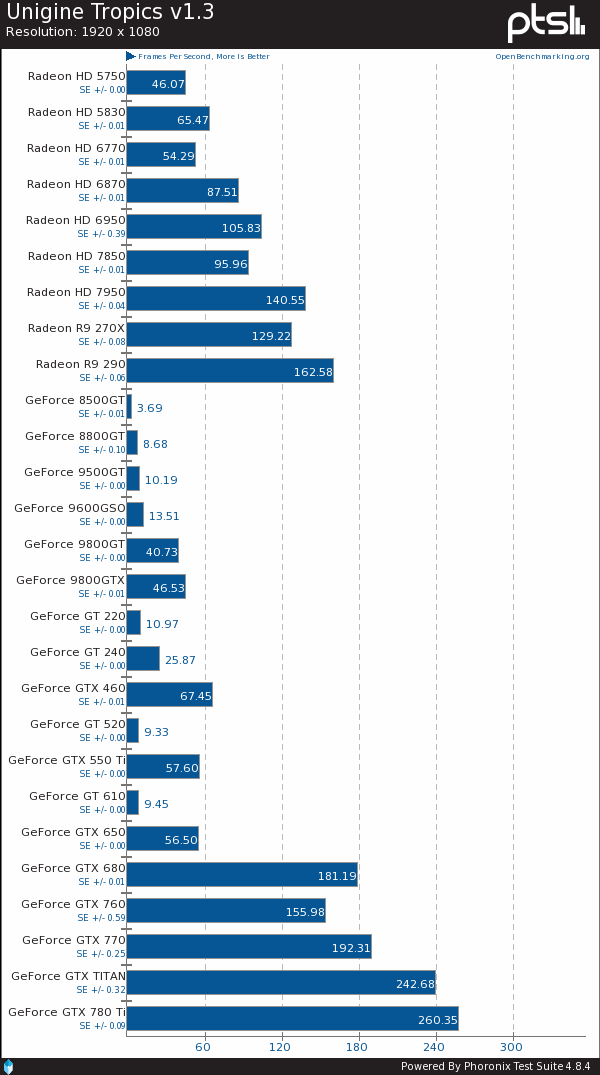 Unigine Tropics:R9 290基本只有GTX 760的水平。