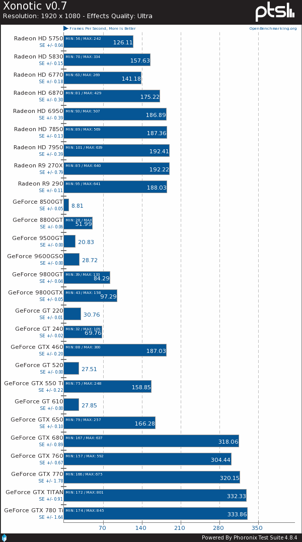 Xonotic:这个项目对GPU的要求其实并不高,更看重CPU,但奇怪的是,这几代高端A卡都停留在180-190FPS,高端N卡则一直有320-330FPS。