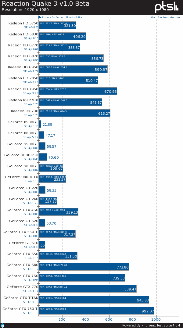 Reaction Quake 3:该项目对GPU要求很低,老点的高端卡和新点的中端卡都可以轻松跑好几百帧。R9 290也超过了600FPS,但还是比GTX 760差了很多。