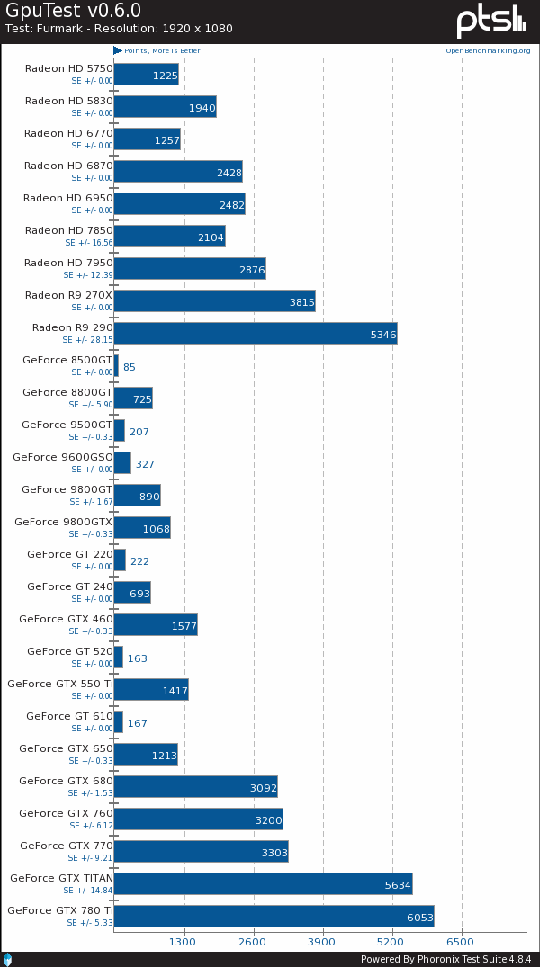 FurMark GPUTest:开普勒家族上来就横刀立马,优势尽现。R9 290成绩也不错,接近了GTX Titan,事实上这是它在Linux下为数不多能和两大顶级N卡抗衡的测试项目之一。