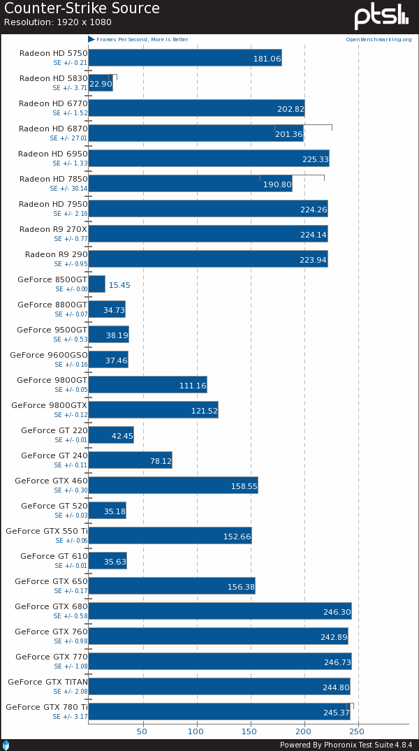 CS Source:类似Xonotic也是更吃CPU。A卡走到220FPS就停滞不前了,N卡则卡在了大约245FPS。