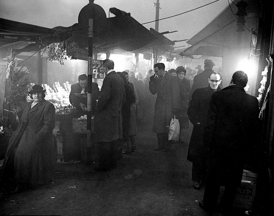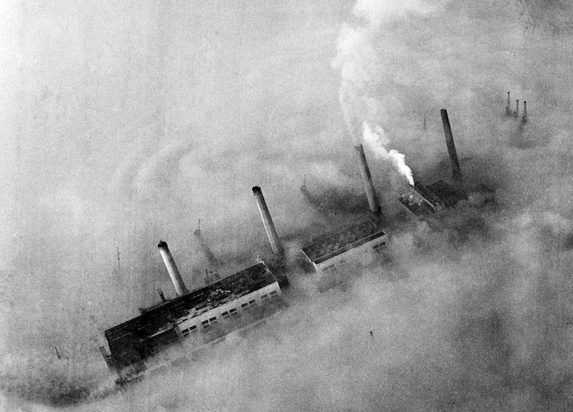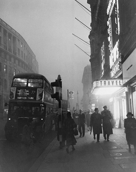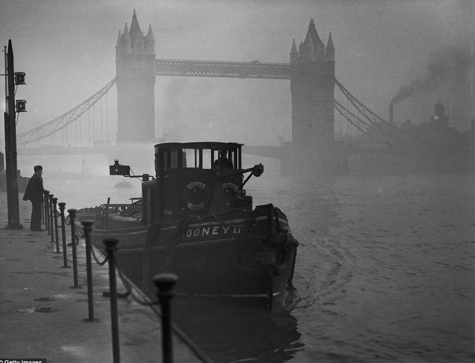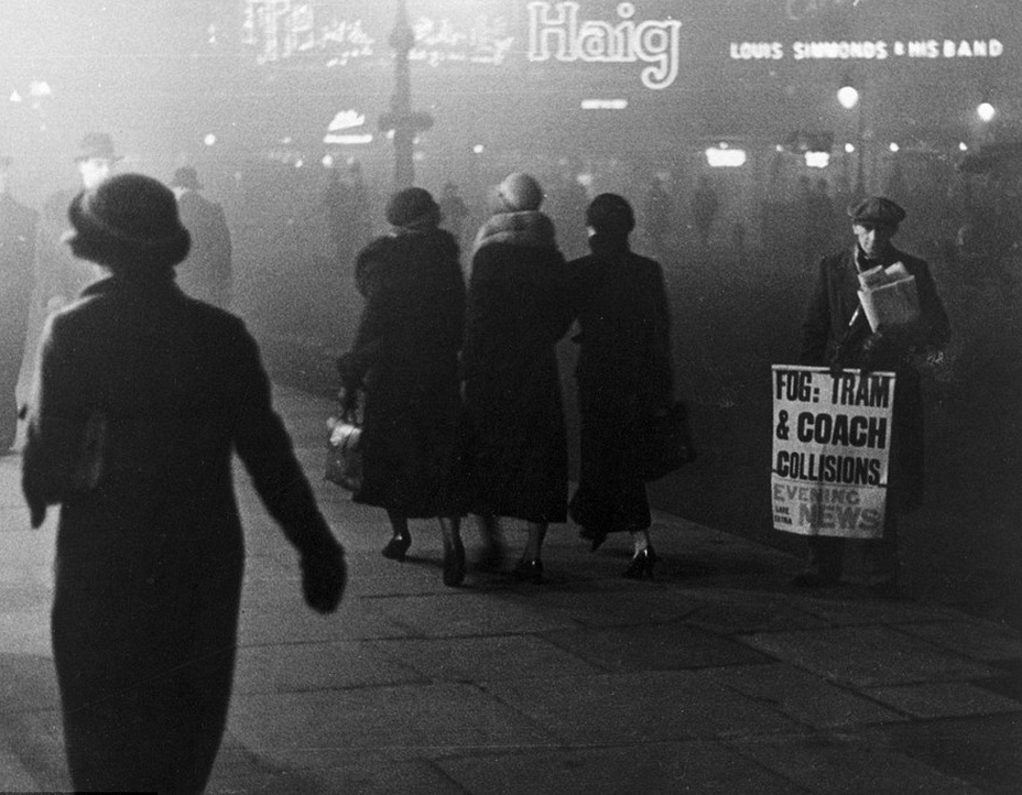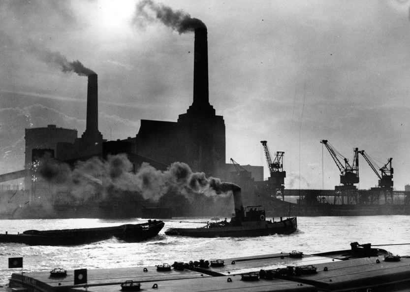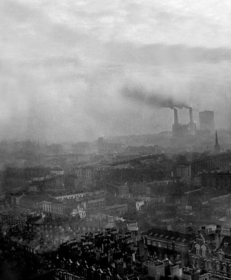 20世纪初的伦敦是一座黑色的工业之都,辉煌却又灰蒙蒙。由煤炭支撑的工业革命让伦敦城内遍布工厂,家庭也烧煤取暖,煤烟排放量急剧增加。烟尘与雾混合变成黄黑色,经常在城市上空笼罩,多天不散。图为1937年2月12日,著名的巴特西发电厂浓烟滚滚,高耸烟囱也成为了伦敦地标之一。