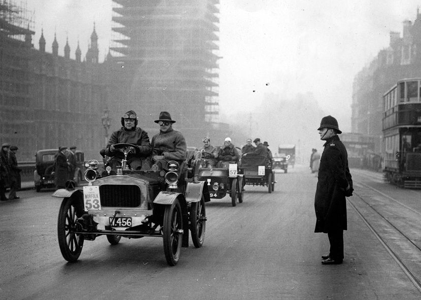 英国早在1875年就曾通过公共卫生法案尝试治污。到了20世纪20年代,由于政府对工业加强管理,煤在工业燃料中所占的比例下降,煤烟污染有所减轻,但并无质的改观。彼时汽车开始普及,排放的尾气让伦敦脆弱的空气雪上加霜。图为1930年,一场汽车比赛在伦敦举行。