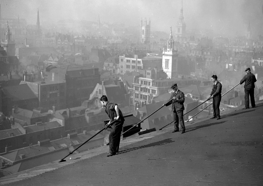 在当时,伦敦的雾天一年可达七八十日。曾经客居伦敦的老舍先生将其描绘为“乌黑的、浑黄的、绛紫的,以致辛辣的、呛人的”伦敦雾霭。图为1930年3月29日,伦敦卡农街车站大楼的屋顶上,几名工人清理厚厚的灰尘。