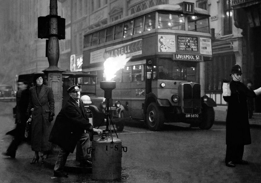 1937年12月20日,伦敦街头,交警点燃作为路标的煤气灯,在大雾中指挥交通。