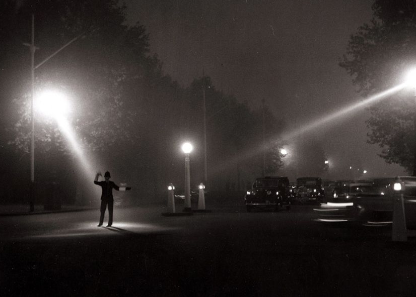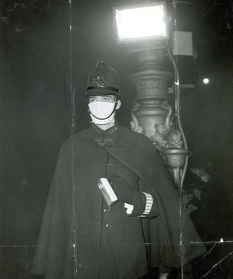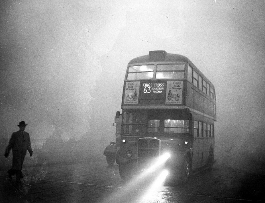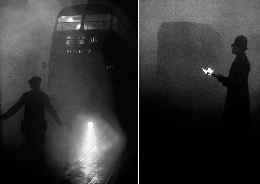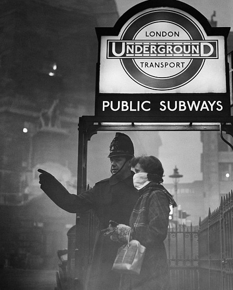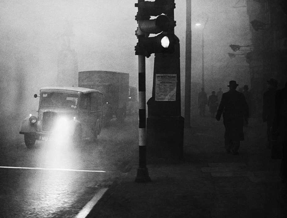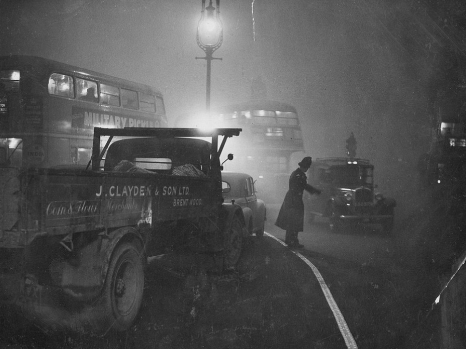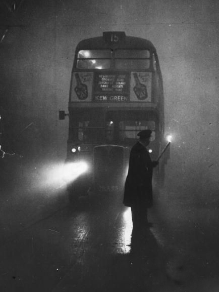不久,伦敦市民也对毒雾产生了反应,许多人感觉不适,发生哮喘、咳嗽等呼吸道症状的病人明显增多。据统计,伦敦地区在烟雾期间共有4703人死亡。在此后两个月内,又有近8000人死于呼吸系统疾病,据称当时全伦敦的公墓和棺材都被用完。图为1952年12月,交警在大雾中指挥交通。