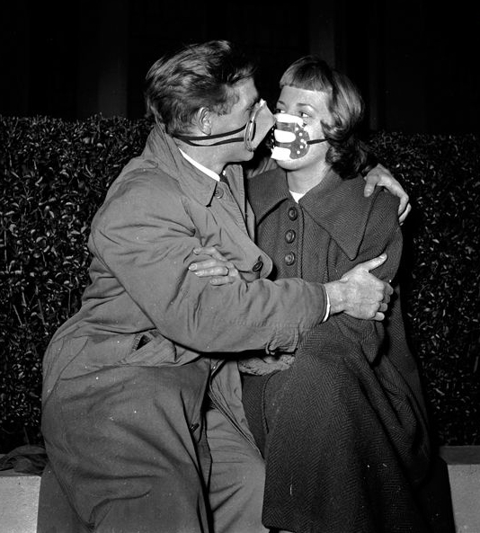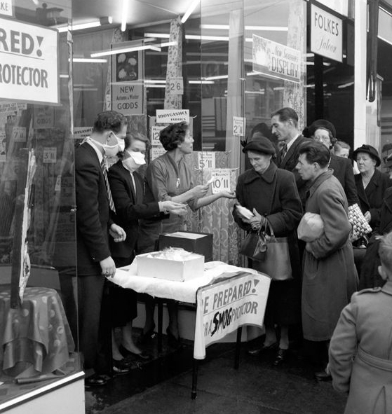 烟雾事件发生后,英国上下舆论大哗,政府任命专门委员会对烟雾受害者情况进行调查。幸存者们的生活也从此改变,成千上万的人患上了支气管炎、冠心病、肺结核等各种疾病。“雾都”往事成为英国人心里不可磨灭的伤疤。图为1953年,一对情侣戴着口罩在户外约会。