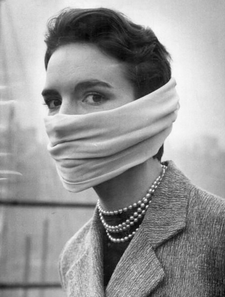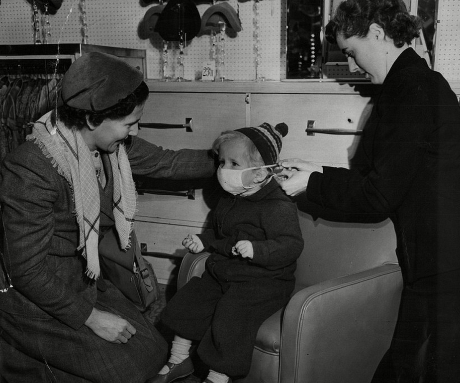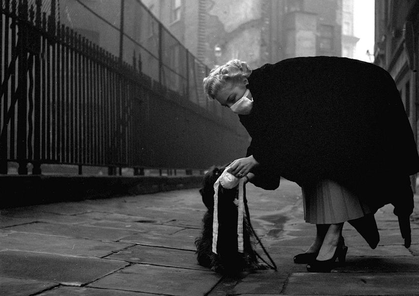 1953年,一位妇女为自己宠物狗戴上口罩。