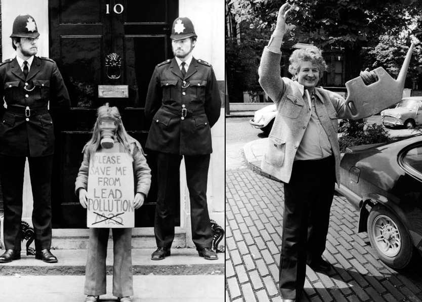 起初人们主要关注汽油的铅污染对人体健康的影响,无铅汽油逐渐受到重视。图左为1978年10月18日,一名小女孩在英国首相府门前抗议汽车尾气污染。图右为1979年6月15日,发明家艾尔沃斯展示一台使用氢气作为燃料的清洁发动机。