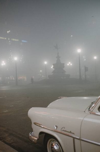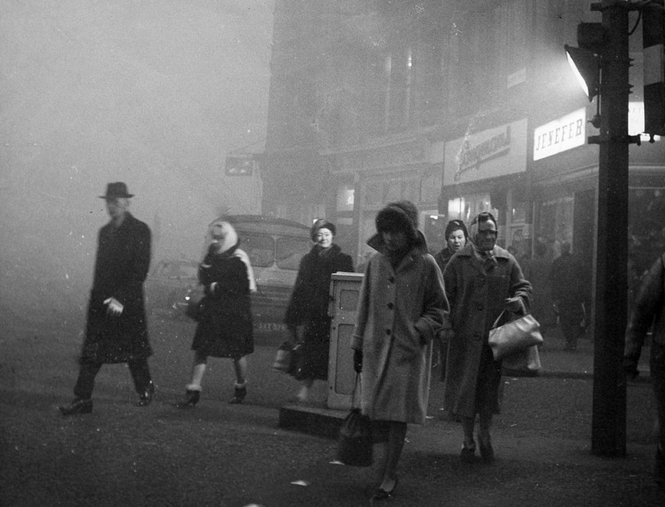 伦敦寒冷漫长的冬季使得居民需要大量烧煤进行取暖,加之地理和气象因素,冬日的伦敦经常大雾弥漫,数日不散。图为1952年冬天,伦敦东区一家工厂在浓雾中继续排放着烟尘。而随后不久,一场史无前例的毒雾之灾降临伦敦。