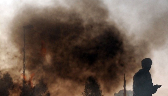 2009年12月10日,印度班加罗尔,工人焚烧轮胎熔解沥青。