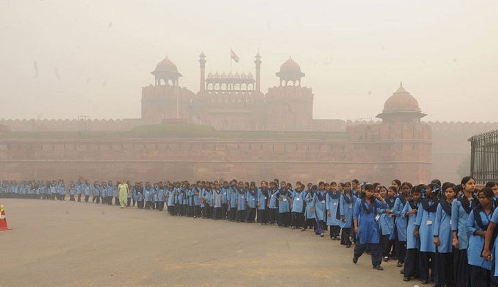 2009年11月7日,印度新德里,学生在大雾中排队参观德里红堡。印度大力兴建2010年英联邦运动会场馆给周边地区带来严重空气污染。