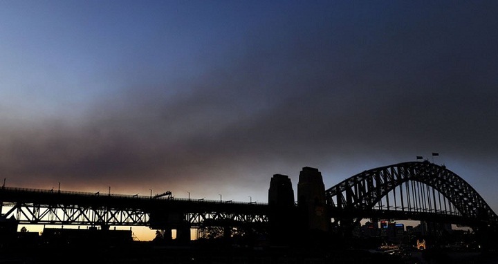 2010年5月11日,澳大利亚悉尼,悉尼海港大桥上浓烟滚滚。