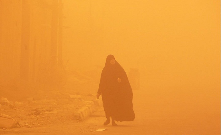 2012年5月22日,伊拉克巴格达,一名妇女走在黄沙飞舞的大街上。伊拉克遭遇特大沙尘暴,首都机场被迫关闭。