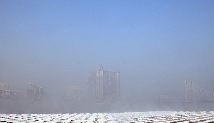 12月4日,湖北武汉继续大雾天气,城市笼罩在雾霾中。