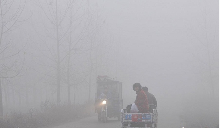2012年11月27日,安徽省毫州市涡阳县曹市镇,车辆在雾中行驶。