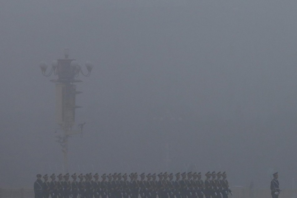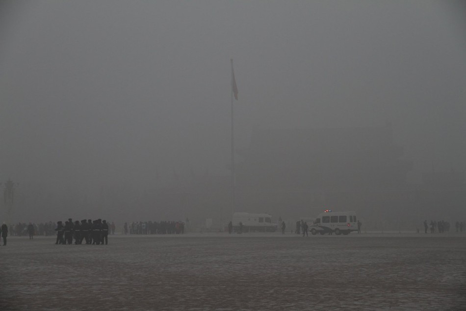1月29日,天安门广场,北京深陷雾霾包围,这已经是1月以来雾霾第四次侵扰京城。