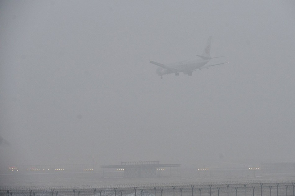 1月29日,北京发布大雾黄色预警,图为大雾下降落的航班。