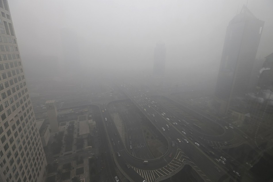 1月29日,北京,国贸桥被雾霾笼罩。