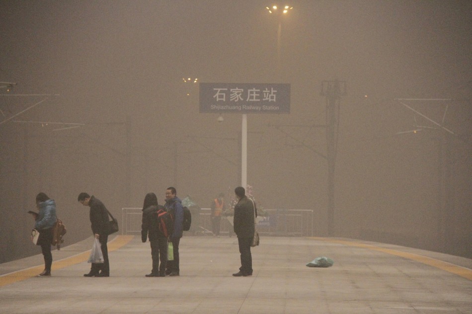 1月28日,石家庄火车站,几名旅客等待上车。当日,15时30分,石家庄市气象台发布了大雾和霾橙色预警信号,预计今天省会雾霾天气仍将持续,东部县(市)的部分路段能见度不足200米。